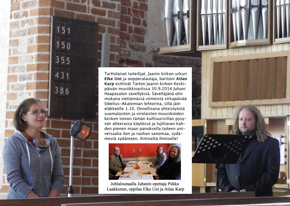 10.10.2010. Kiitos esiintyjille, kiitos kuulijoille! Konsertista lisää tässä! Konsertin taiteilijat olivat Aulikki ja Pertti Eerola, Nicholas Söderlund ja Tuula Hällström, Markku Hietaharju, Susanne Kujala ja Kari Vuola sekä Canzonetta Nova -kuoro, johtajana ja solistina Erkki Rajamäki. Konsertin järjestivät yhdessä Järvenpään Sibelius-viikot, Sibelius-Akatemia ja Järvenpään seurakunta. |